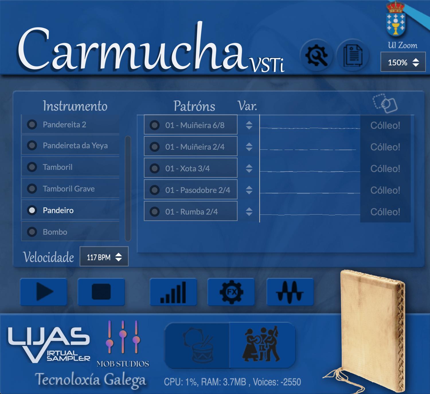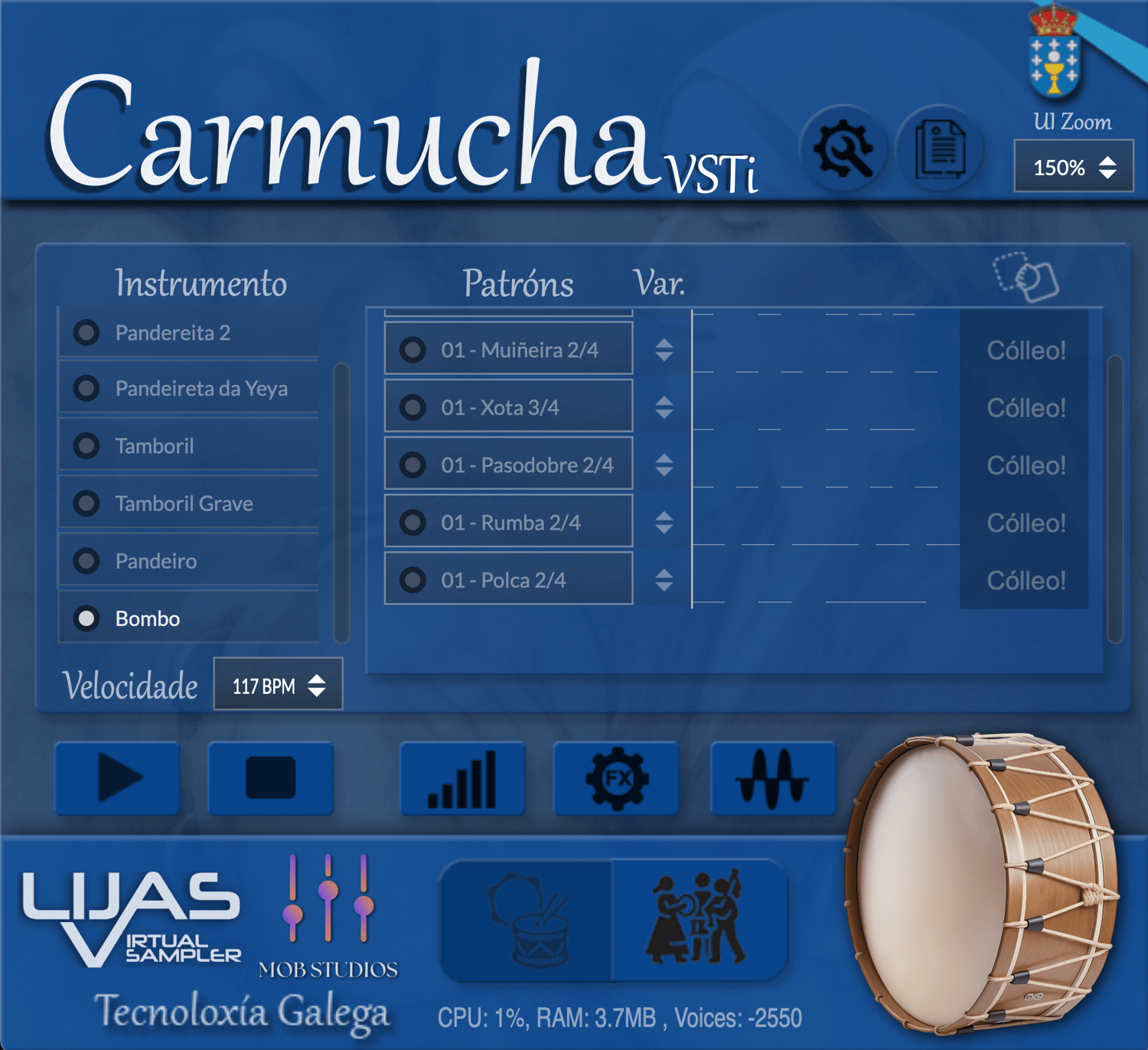 El plugin cuenta con un total de 250 patrones rítmicos que incluyen muiñeiras, jotas, pasodobles y rumbas. Carmucha está disponible para Windows y Mac en versiones independientes, VST y AU.