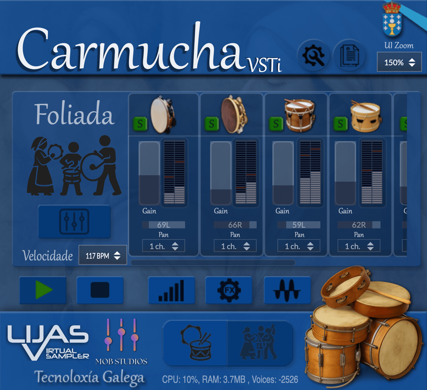 Carmucha VST es la primera herramienta de percusión gallega gratuita y accesible. Ofrece dos versiones: una versión VST para producciones musicales en DAW y una versión independiente para escritorio.